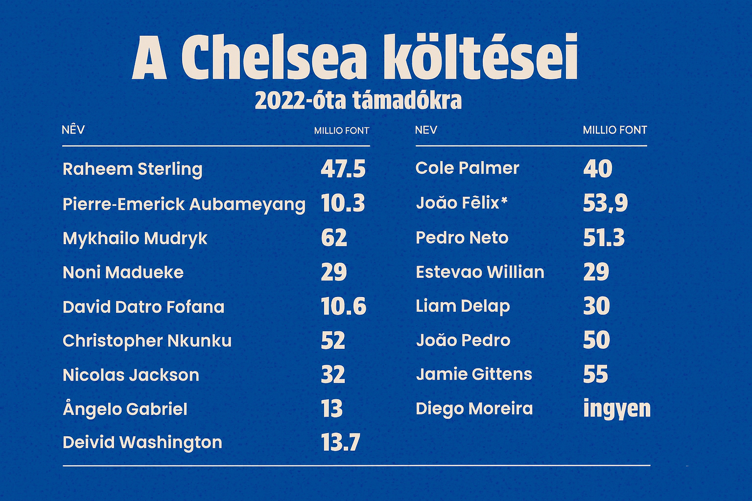 Joao Félix, Nicolas Jackson és Cole Palmer helyett, koncentráljunk a legfrissebb trióra. A Kékek vezetősége ismét nem spórolt: Gittensért 55 millió fontot kasszírozott a Borussia Dortmund, Pedroért 50 millió fontot vágott zsebre a Brighton, míg az Ipswich Town 30 millió fonttal gazdagodott, Delap játékjogáért cserébe. Persze, a játékosok teljesítményét még nem lehet megítélni, de rögtön felmerül a kérdés: hogyan kapnak elegendő játékpercet a jelenleg a keretben lévő tucatnyi támadó mellett?