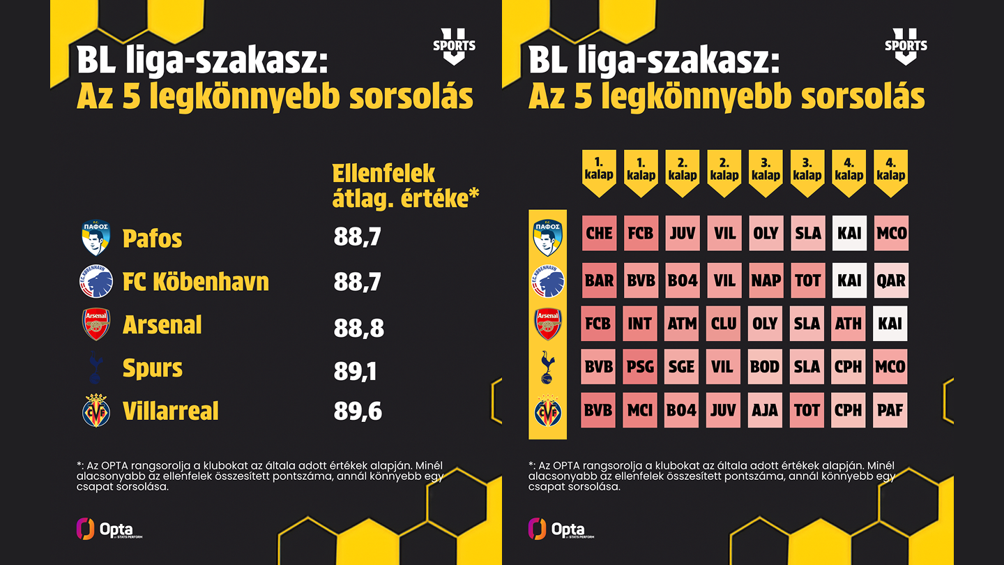 A tavalyi döntős Inter a 9., a Real Madrid a 12., a Manchester City a 14., miközben az élen az újonc, alighanem pofozógép szerepre kárhoztatott Pafos áll. A Köbenhavn szintén nem sok sikerélményre számíthat az óriások között, a Villarreal és az Ajax viszont élhet a lehetőséggel – ha minden a papírforma szerint történik, könnyedén odaérhetnek a legjobb 24 közé.