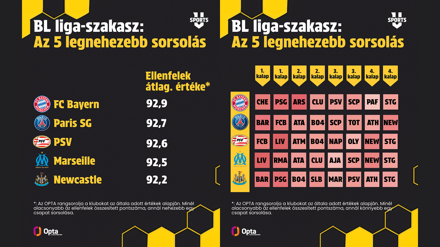 A borzalmas nyár után a BL-ben is folytatódik a Newcastle United vesszőfutása: a Szarkák az 5. helyet csípték el a legnehezebb sorsolást kapó klubok listáján. A Marseille épphogy leszorult a dobogóról, amire a PSV, a címvédő PSG, valamint a Bayern München állhatott fel. A bajor klub két idegenbeli csúcsrangadót vív a PSG-Arsenal duó ellen, de a Chelsea müncheni látogatása sem lesz sétagalopp…