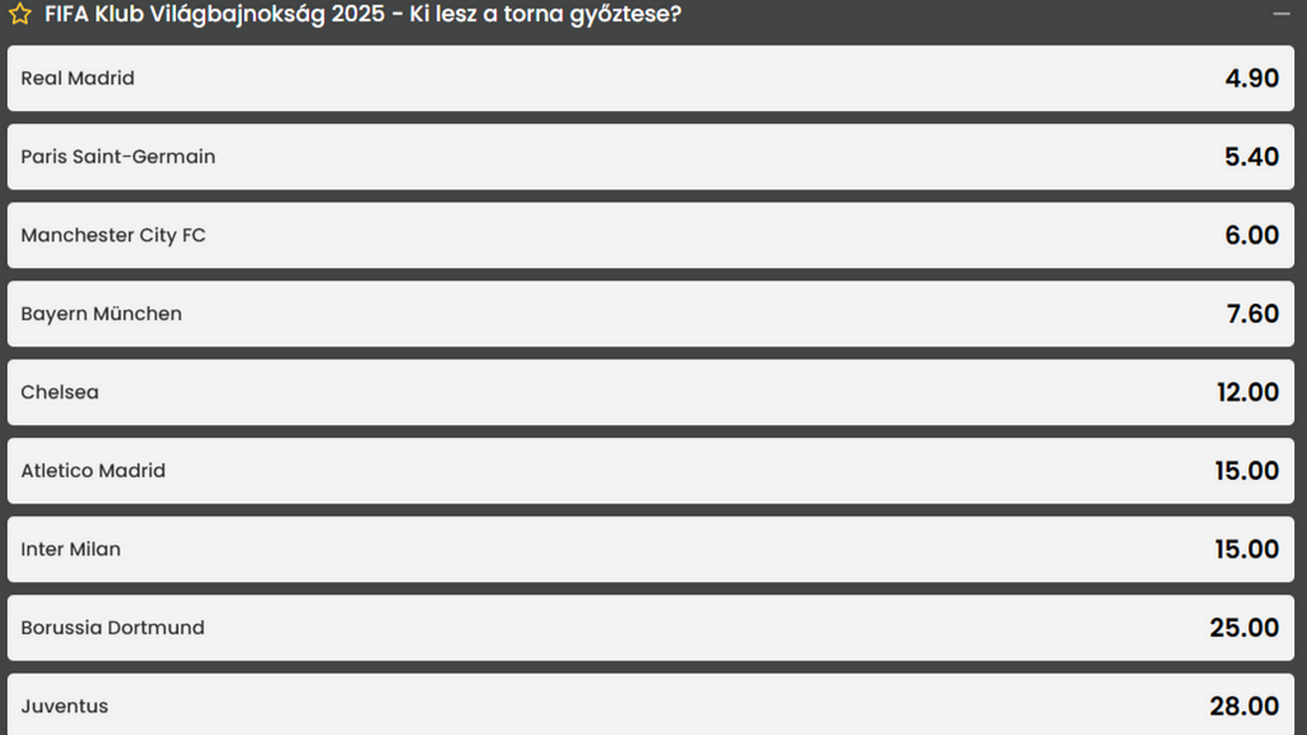 A Vegas.hu változatos outright fogadásokkal és szuper oddsokkal készül a 2025-ös klub-vb összes mérkőzésére – vesd bele magad a nyári futball-lázba!